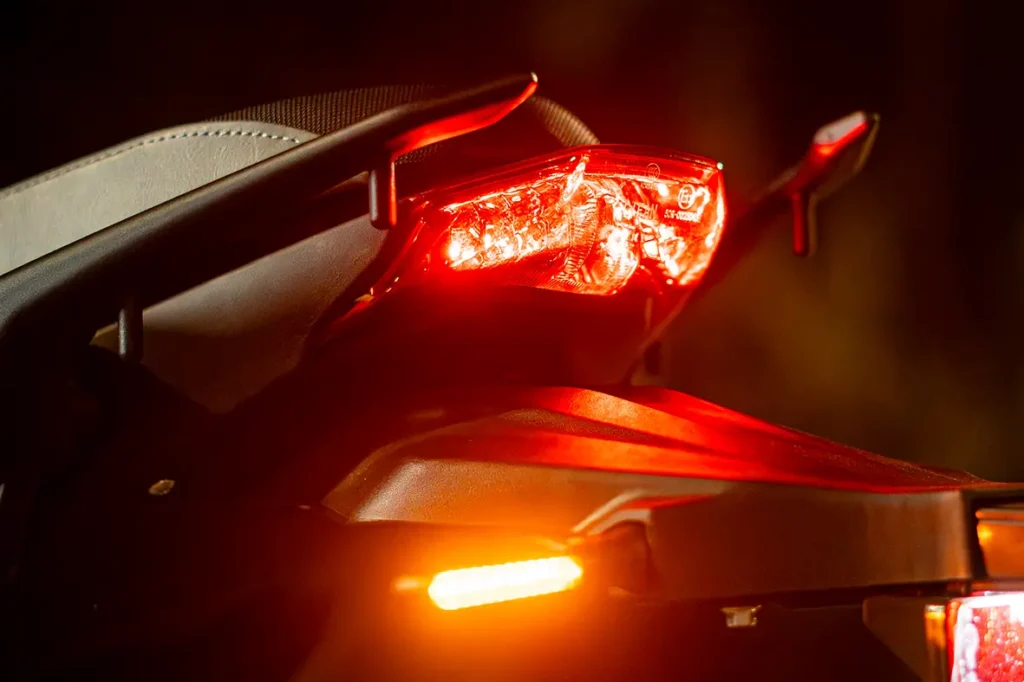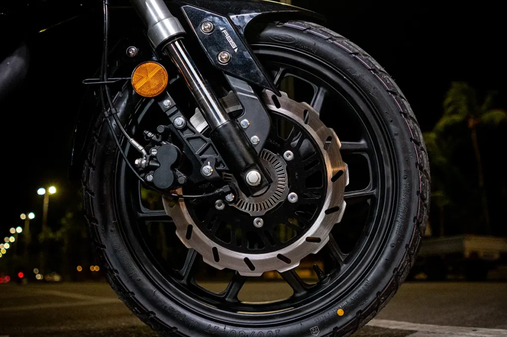 A STORM é equipada com rodas de liga leve, que oferecem um excelente equilíbrio entre resistência e leveza. As rodas, tanto dianteiras quanto traseiras, possuem aro 17”, garantindo mais estabilidade e aderência ao solo, ideal para diferentes tipos de terreno. Seus freios à disco, tanto na frente quanto atrás, contam com o avançado sistema ABS de dois canais, que evita o travamento das rodas em frenagens mais bruscas, garantindo maior segurança e controle. Um conjunto que combina desempenho e tecnologia.