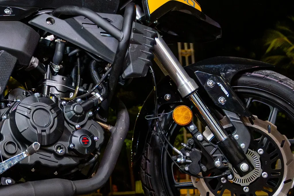Na parte dianteira, conta com garfo telescópico invertido, que proporciona maior rigidez e controle, resultando em uma condução mais precisa. Já a suspensão traseira é equipada com balança monoamortecedora (monoshock), absorvendo impactos de maneira eficiente e garantindo maior estabilidade durante a pilotagem. Um conjunto que une tecnologia e conforto, ideal para aventuras e trajetos desafiadores.