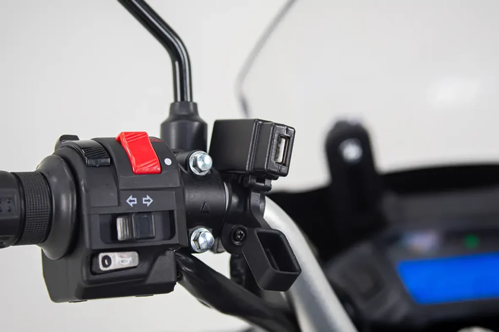 Protetor de escapamento, porta USB, cavalete central e descanso lateral com sensor.